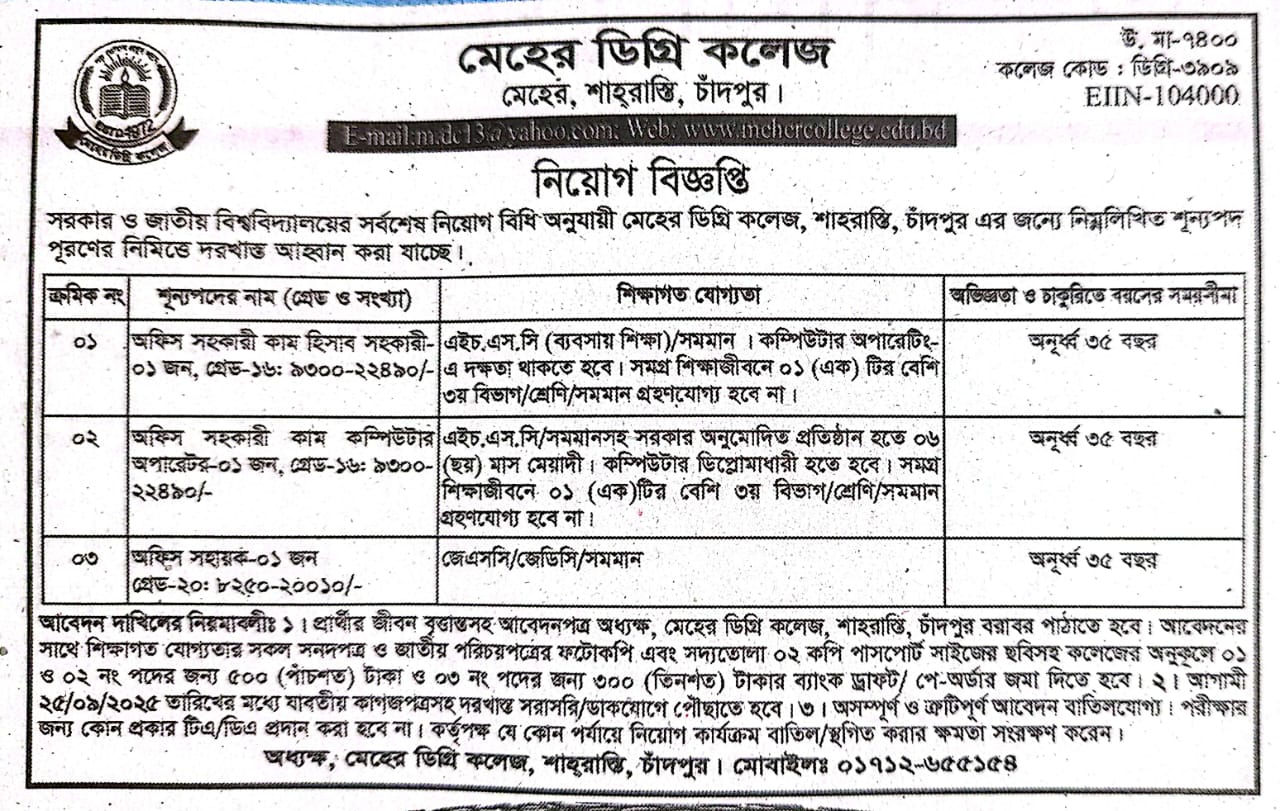 09-Sep-2025 নিয়োগ বিজ্ঞপ্তি-২০২৫