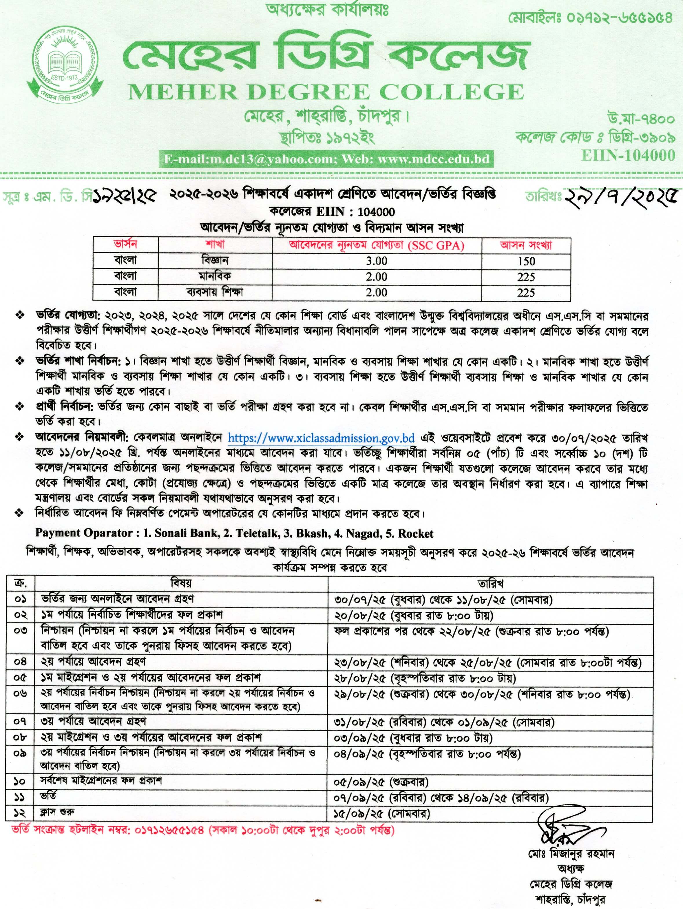 27-Jul-2025 ২০২৫-২০২৬ শিক্ষাবর্ষে একাদশ শ্রেণিতে আবেদন/ভর্তির বিজ্ঞপ্তি